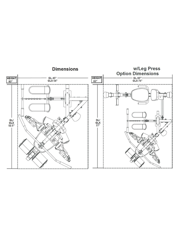 With Optional Leg Press 64.5″ L x 77″ W x 82.5″ H