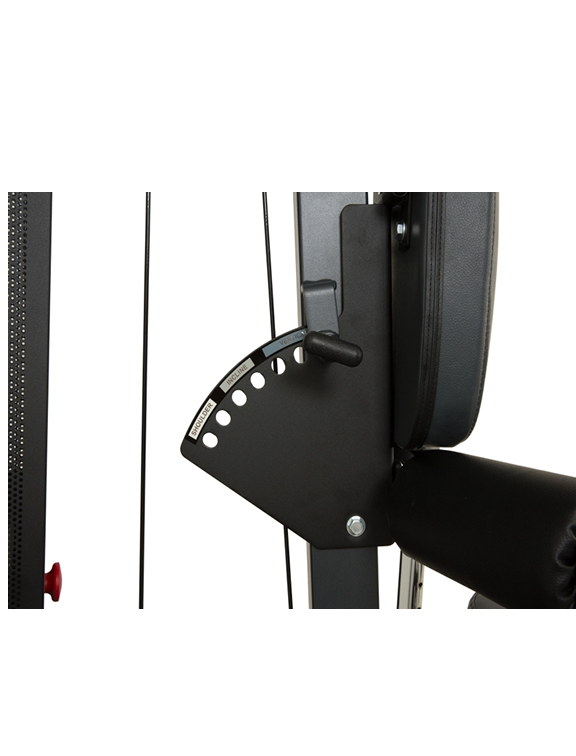The Attain MFT Multi Functional Trainer comes standard with a back support bar. This is a straight bar with a cushion in the middle, which you can attach to the adjustable arm. By removing the seat, you can stand against the back support bar and use it as a backrest during the chest press or chest fly exercise with the cables. Of course, you can also use the bar for other exercises.